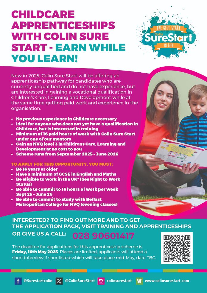 Returning in 2026, Colin Sure Start will be offering an apprenticeship pathway for candidates who are currently unqualified and do not have experience, but are interested in gaining a vocational qualification in Children's Care, Learning and Development while at the same time getting paid work and experience in the organisation. The apprenticeship will last for one academic year from September through to June, during which the apprentice will be studying in the evening enrolled on an NVQ Level 2 or 3 with Belfast Metropolitan College, and at the same time during this period the organisation will facilitate a minimum of 16 hours per week of work in a variety of Sure Start groups and services, paid at the apprenticeship rates set be the Government. The apprentice will be supported and mentored by the organisation, and will be given experience in some of our childcare and early years groups, antenatal and health support programmes, family support and parent programmes and SEN services under the guidance of our experienced staff and managers.